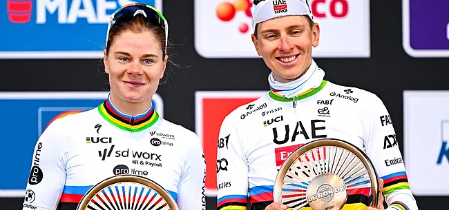 Het zorgde naderhand ook voor een iconisch beeld. Tadej Pogacar won bij de mannen, en ook hij deed dat in de regenboogtrui. Het leverde een foto voor de geschiedenisboeken op, met wereldkampioenen Kopecky en Pogacar. Onze landgenote toont bovendien haar grote bewondering voor de Sloveen.